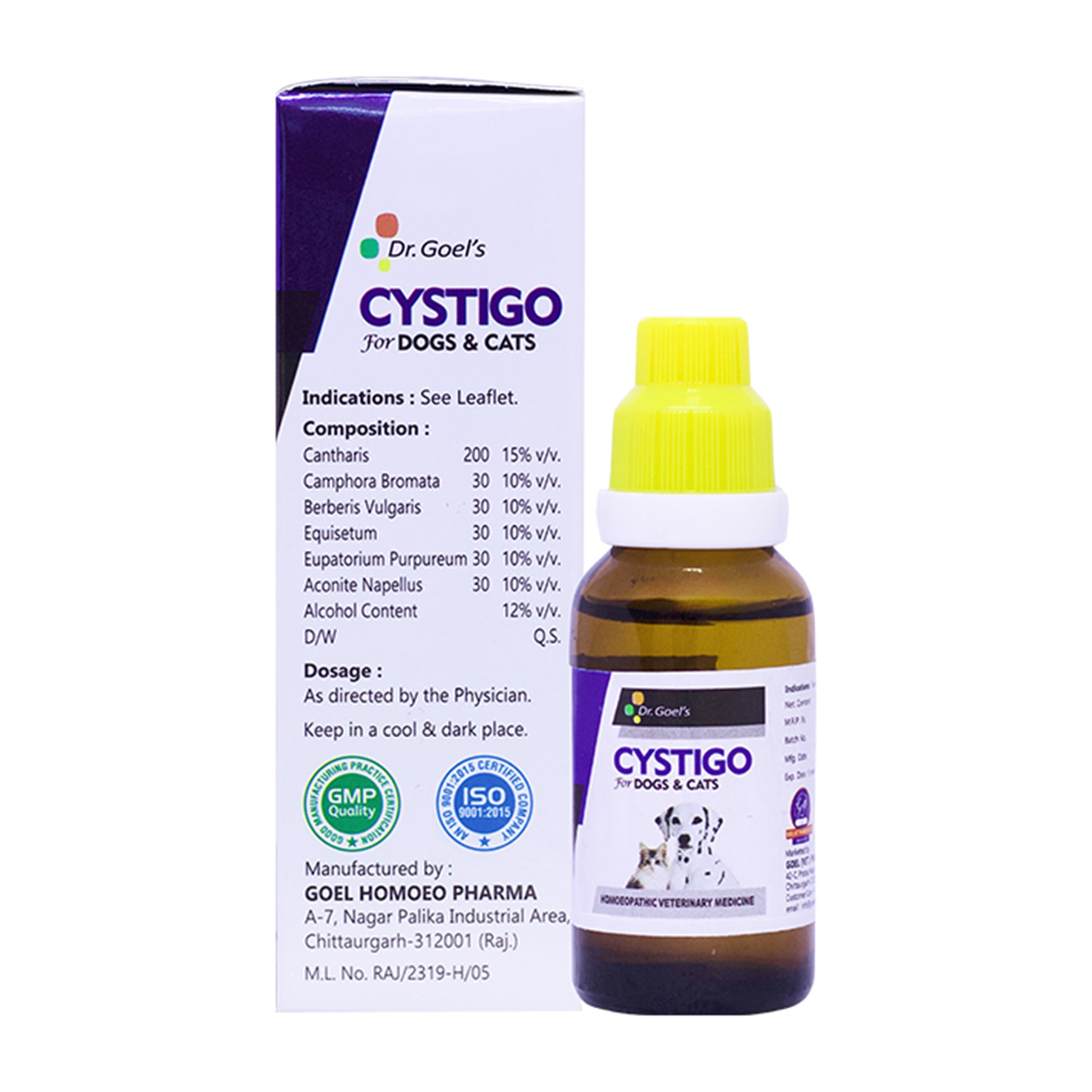 Homeopathic remedies work on the principle of “similia similibus curanter” which means “like cures like”, so is our CYSTIGO. Hence, such formulations that cause symptoms like a diseased animal in a healthy one are used to prepare this wonder drug formula to be able to treat urinary tract infections of varied reasons. It is a formulation that is developed by a renowned Indian veterinarian after consulting many homeopaths and conducting advanced field trails over the years.