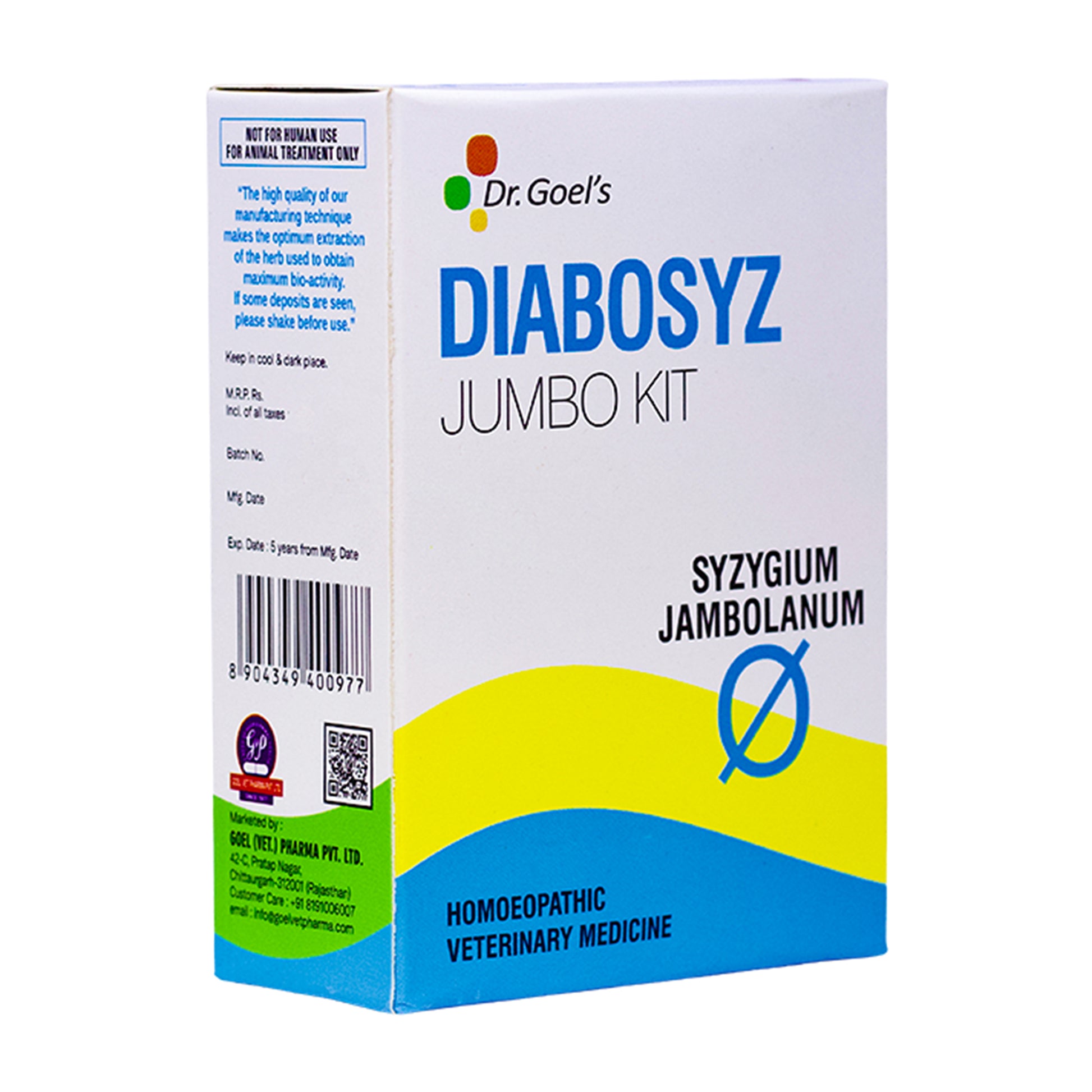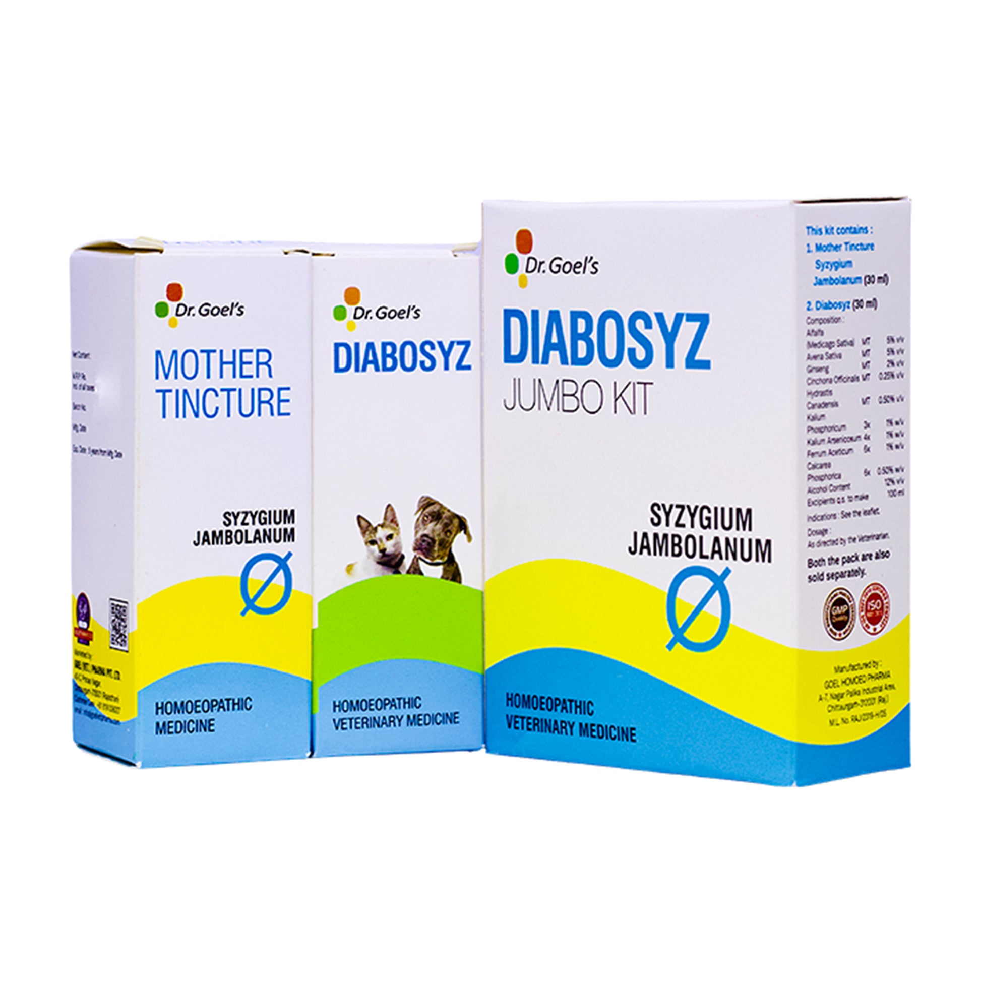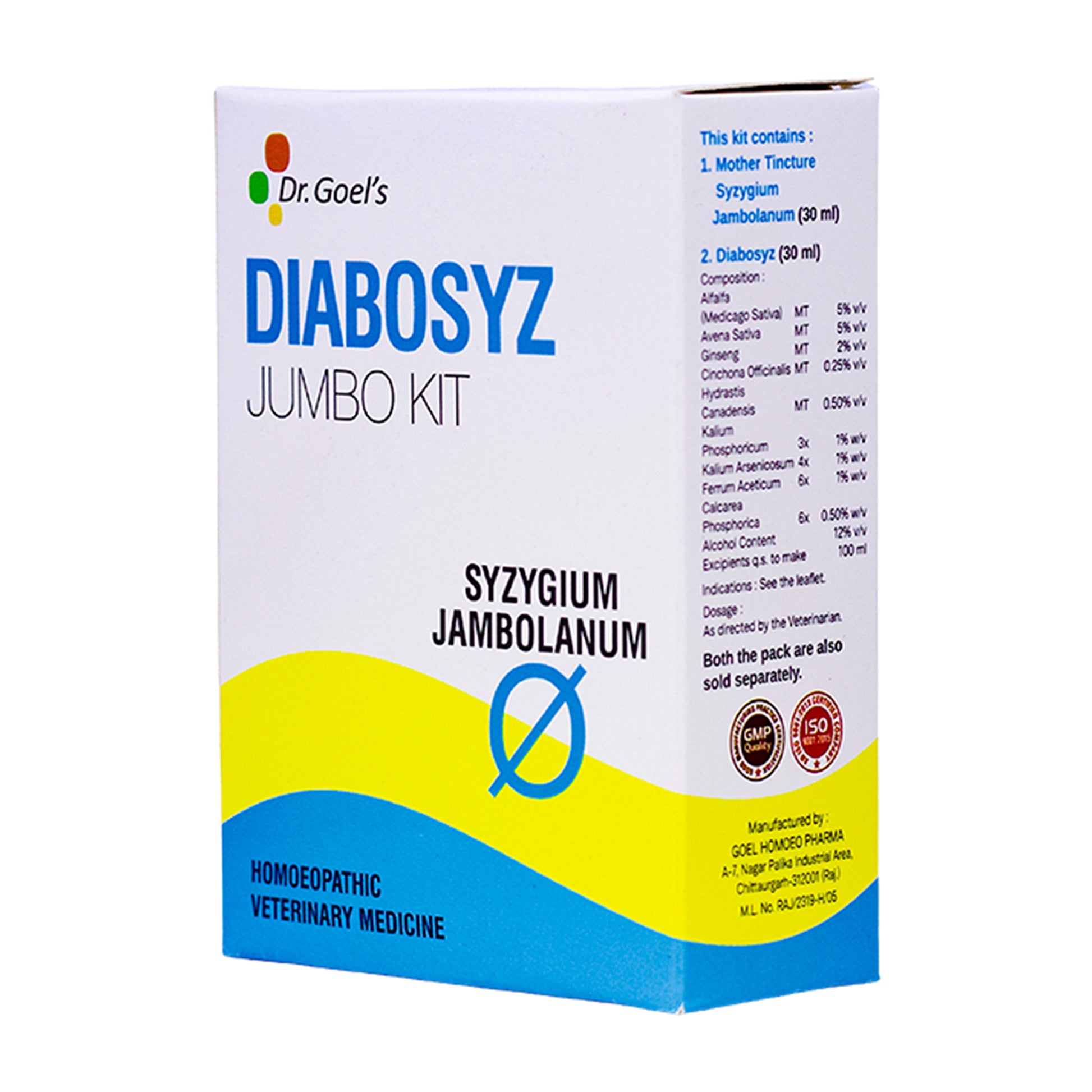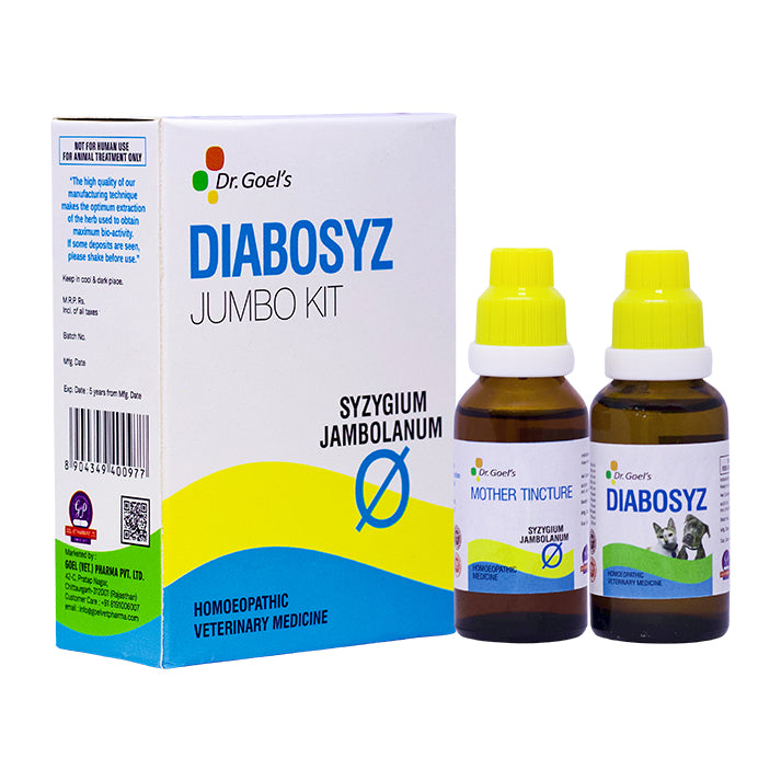 DIABOSYZ JUMBO KIT for PETS 30ML is the best remedy for treating conditions of For Diabetes and associated problems. DIABOSYZ JUMBO KIT contains two medicines one is Syzygium Jambolanum Q 30ML and the other one is DIABOSYZ – 30 ml which is a Homeopathic Veterinary Medicine that regulates the Hormones in pets by stimulating the Pancreatic gland. DIABOSYZ JUMBO KIT is the best Homeopathic Veterinary Medicine for pet animals in the case of For Diabetes and associated problems like frequent urination, unusual thrust, loss of body weight, etc.