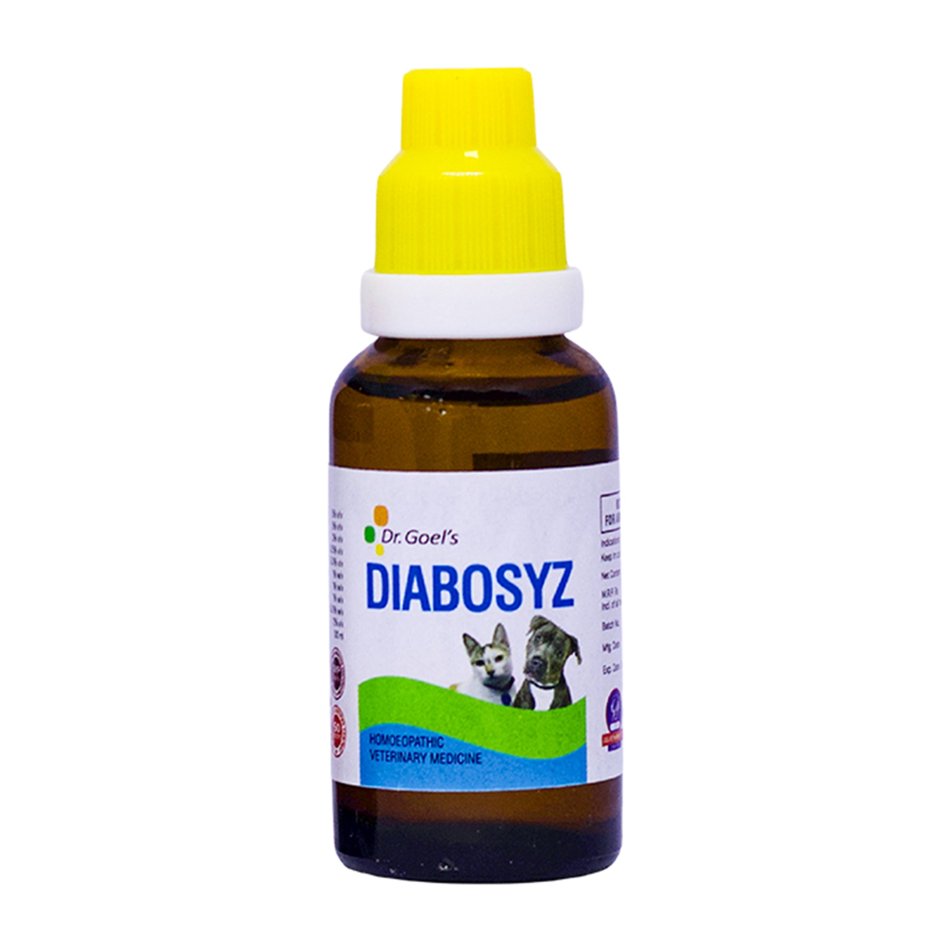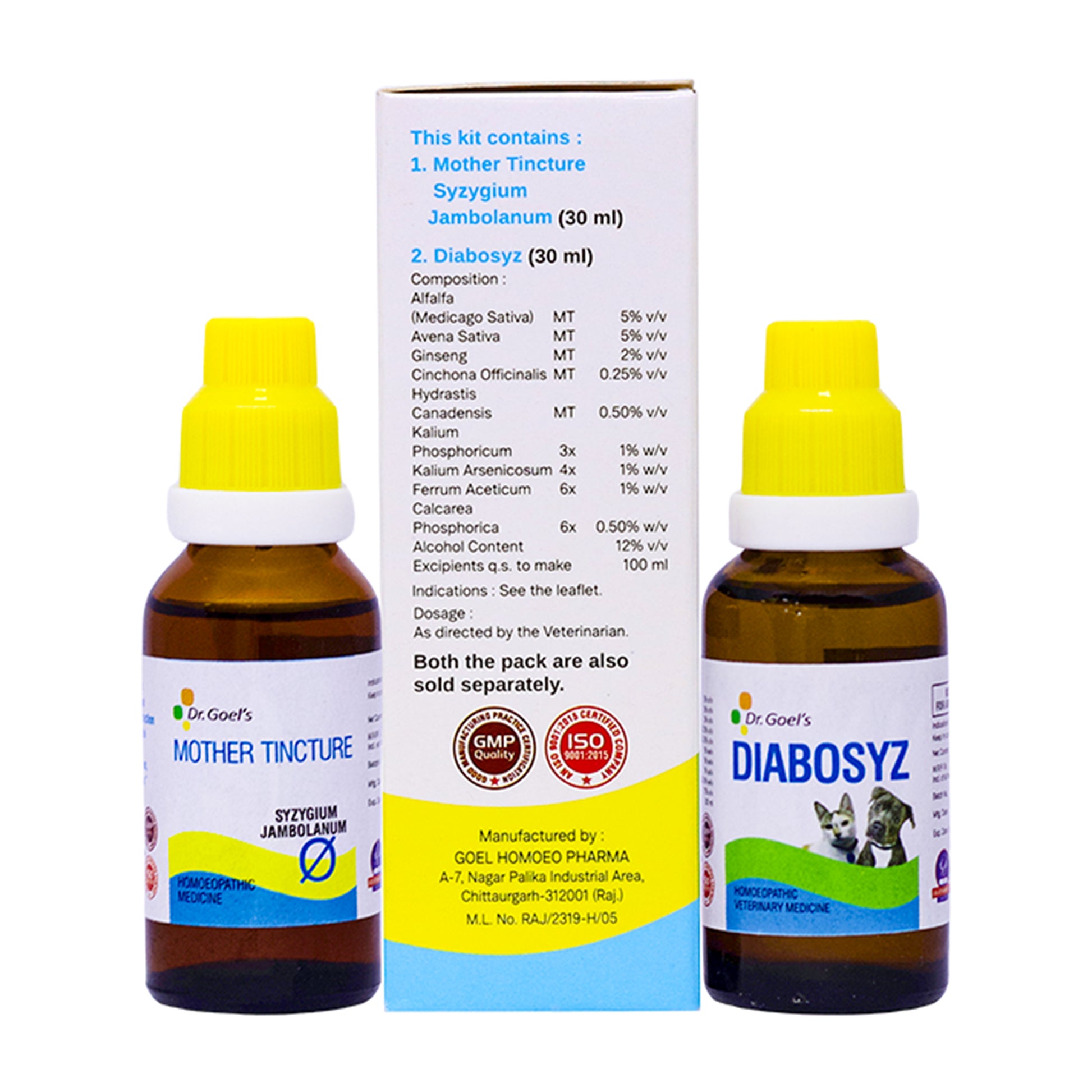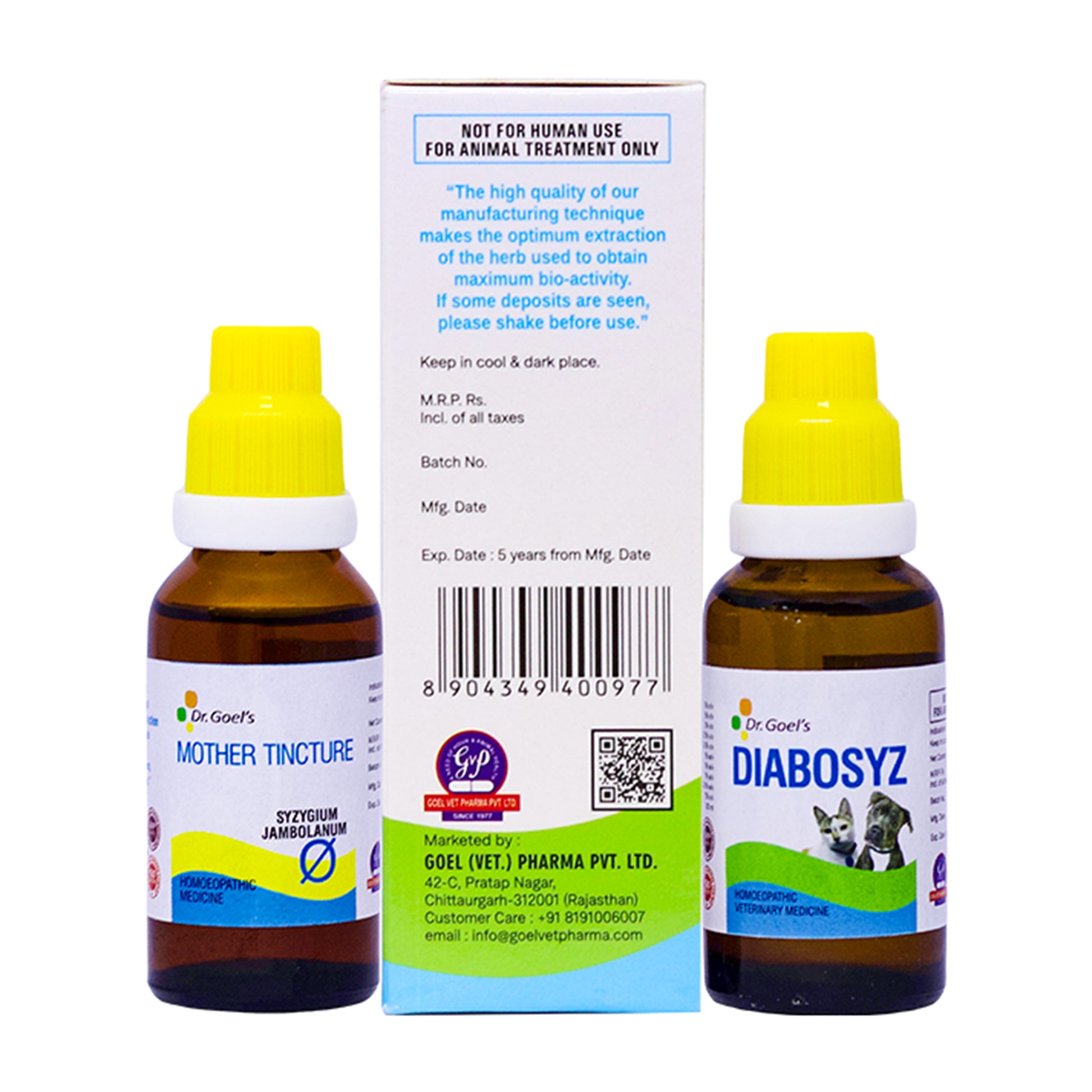 DIABOSYZ JUMBO KIT for PETS 30ML is the best remedy for treating conditions of For Diabetes and associated problems. DIABOSYZ JUMBO KIT contains two medicines one is Syzygium Jambolanum Q 30ML and the other one is DIABOSYZ – 30 ml which is a Homeopathic Veterinary Medicine that regulates the Hormones in pets by stimulating the Pancreatic gland. DIABOSYZ JUMBO KIT is the best Homeopathic Veterinary Medicine for pet animals in the case of For Diabetes and associated problems like frequent urination, unusual thrust, loss of body weight, etc.