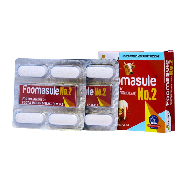 FOOMASULE No. 2 is the best available Homeopathic Veterinary Medicine for treating FOOT & MOUTH DISEASE (FMD) in cattle. It is effective against all strains of FMD virus. It cures the lesions in the mouth within 24 hours and helps the animal in grazing.