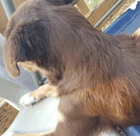 Spot and eliminate any food allergies, seasonal shedding is normal for dogs. Dermisule drops + me and my skin and coat granules to promote better skin health and fur growth.