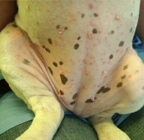 My 8yr old female shihtzu has hyper pigmentation on belly and scratches.. only red skin..