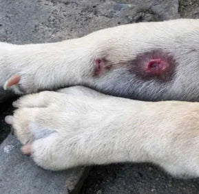 Hot spots, also called acute moist dermatitis, are small areas that appear red, iritated, and inflamed. They are most commonly found on a pet’s head, hips, or chest and often feel hot to the touch. Hot spots can result from a wide range of conditions, including infections, allergies, insect bites, and excessive licking and chewing. Treatment consists of cleansing the hot spot and addressing the underlying condition