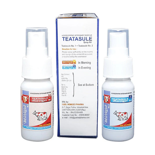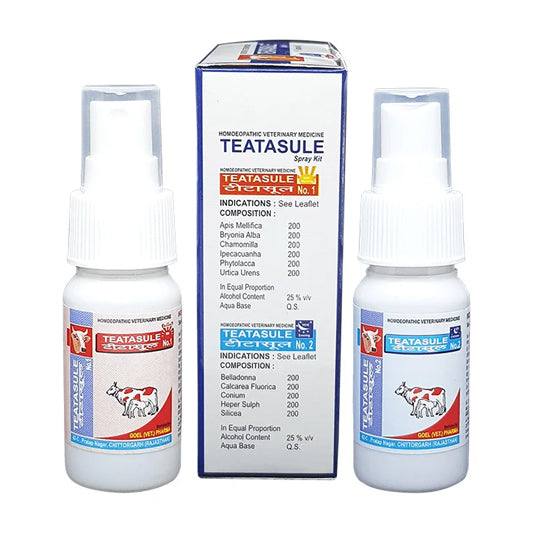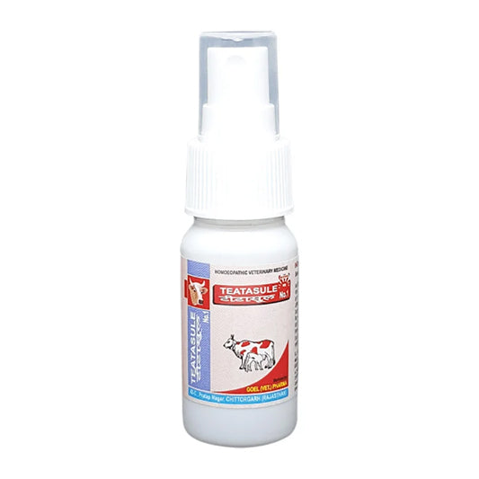 टीटासूल लिक्विड स्प्रे किट थनैला रोग के उपचार हेतु बेहतरीन व कारगर होम्योपैथिक पशु औषधि है, जोकि मादा पशुओं में थनैला रोग की सभी दशाओं के लिए अतिउपयुक्त होम्योपैथिक दवाई है | यह दूध के गुलाबी, दूध में खून के थक्के, दूध में पस के कारण पीलापन, दूध फटना, पानी सा दूध होना तथा अयन/बाख का पत्थर जैसा सख़्त होना और गाय और भैंस के थनों का आकार फनल के रूप में होने पर यह दवाई काफी प्रभावी है|