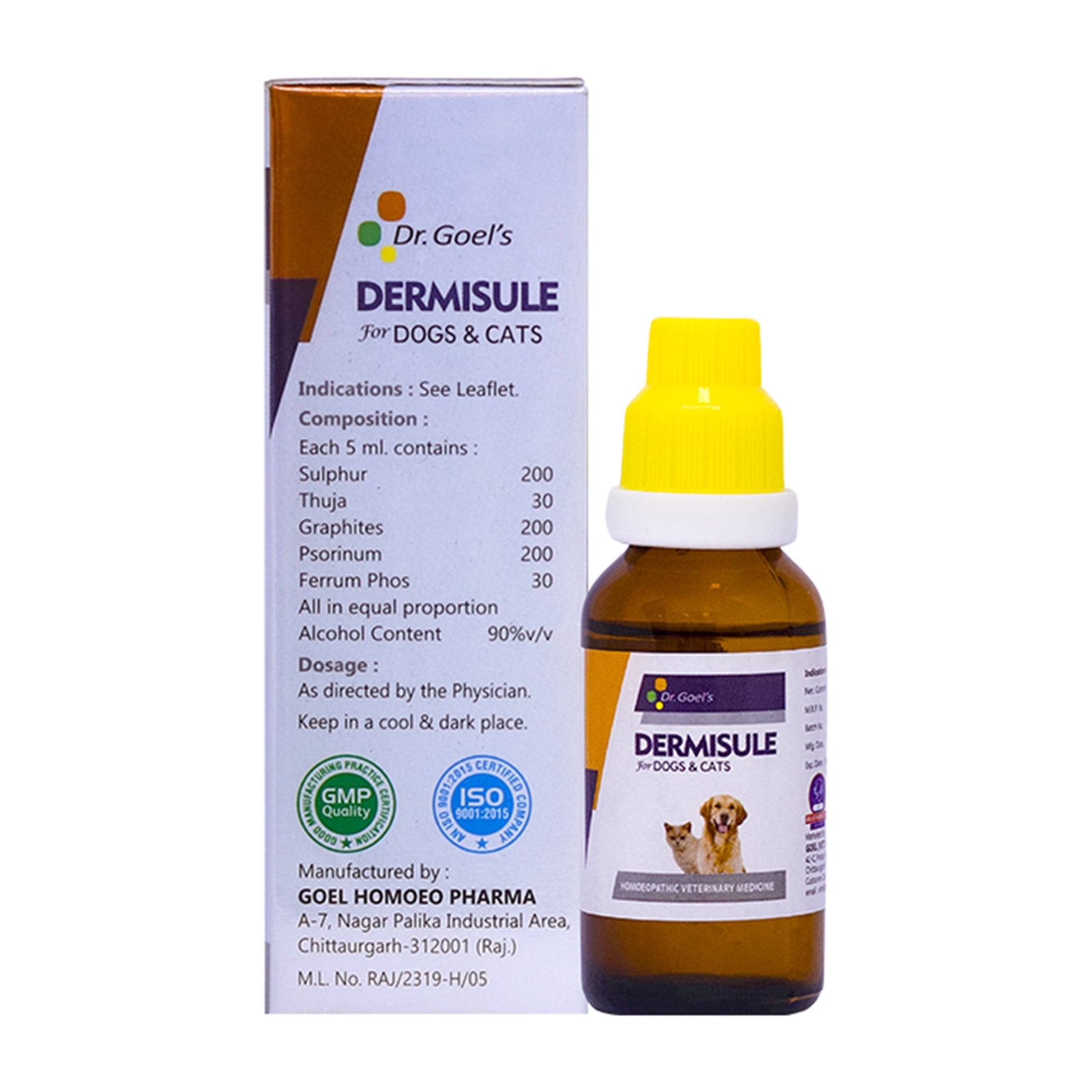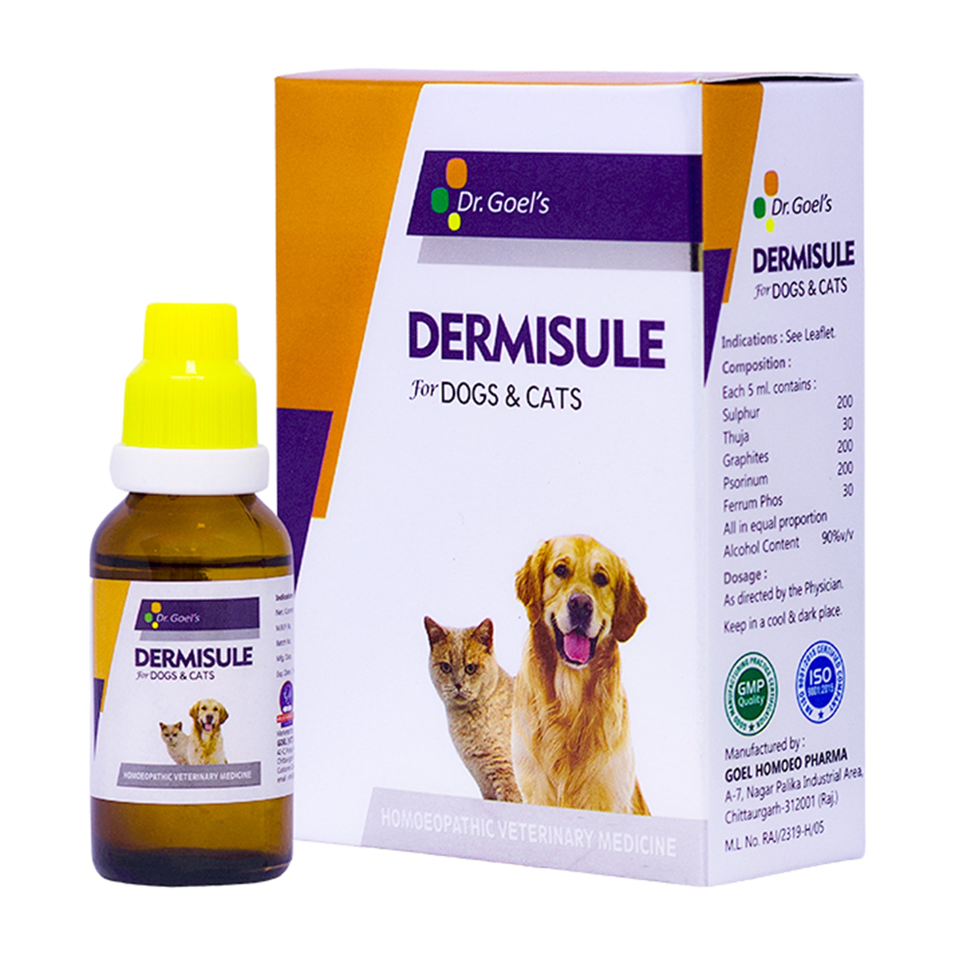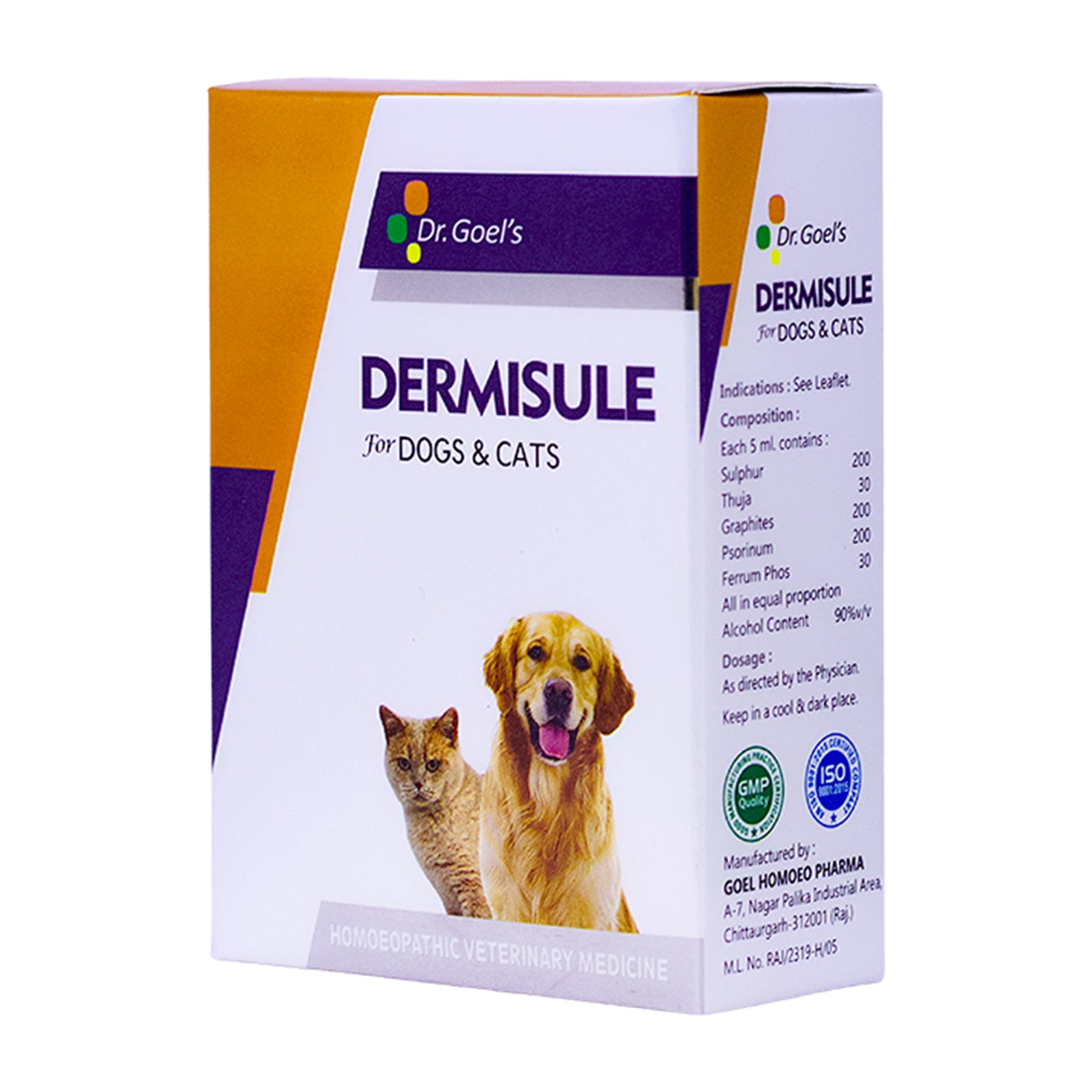 Homeopathic remedies work on the principle of “similia similibus curanter” which means “like cures like”, so our DERMISULE for pets is the best remedy for dogs suffering from different skin conditions like eczema, allergies, rashes, lesions with hair loss, redness, dry, scaly, pus, or bloody discharge. Specific or general lesions or spots as in Mange disease can also be improved.