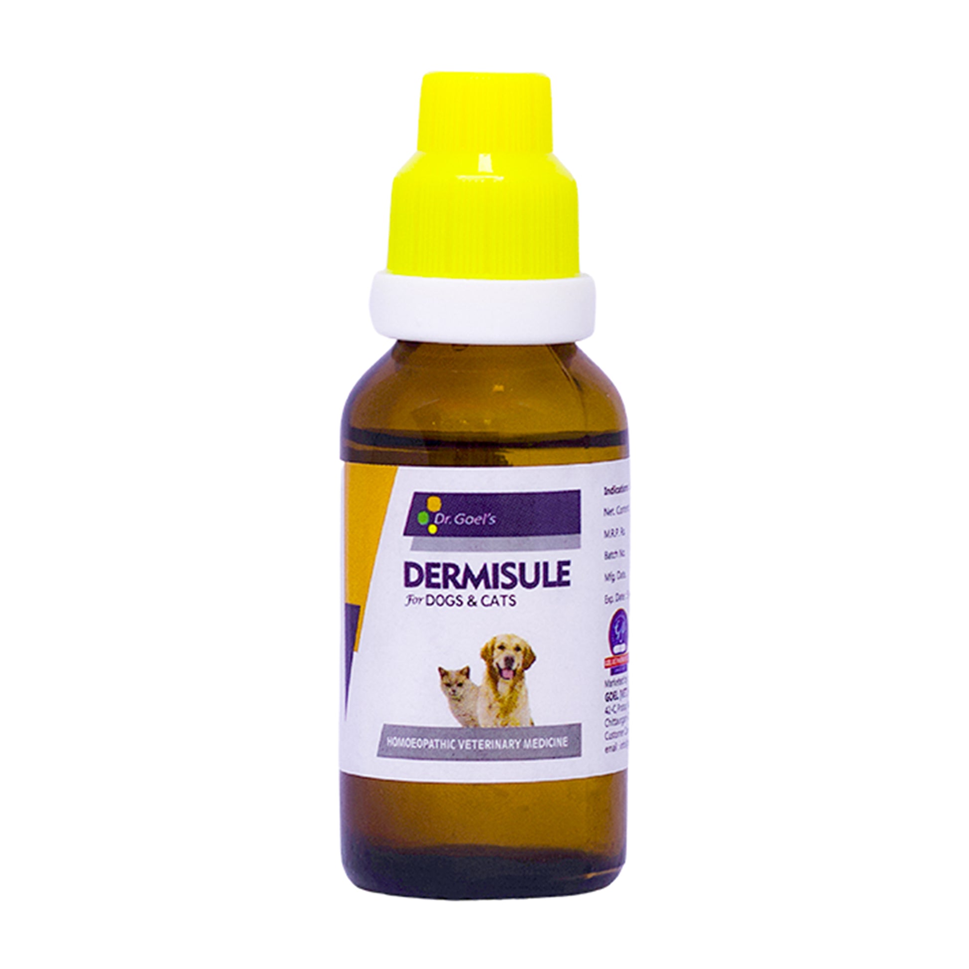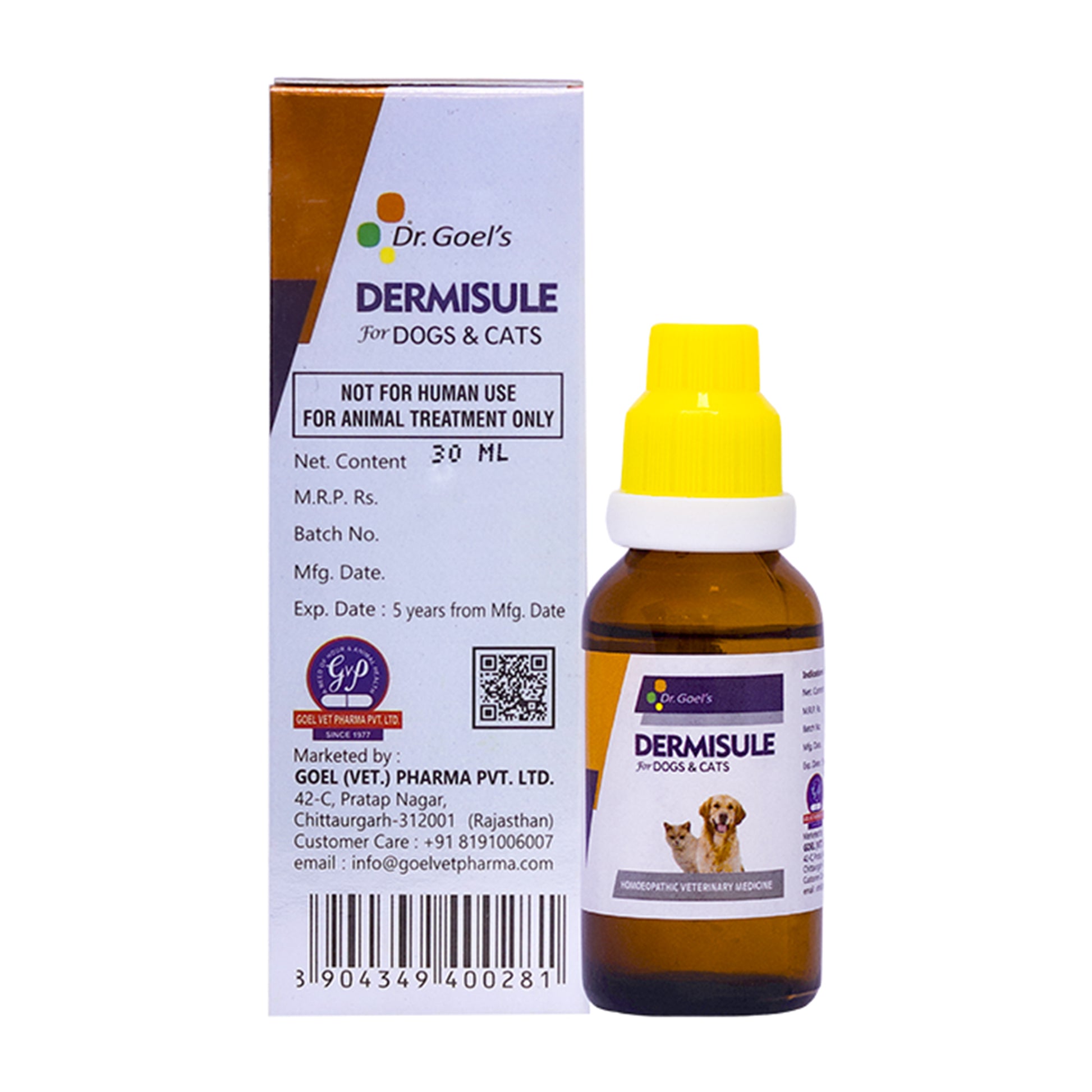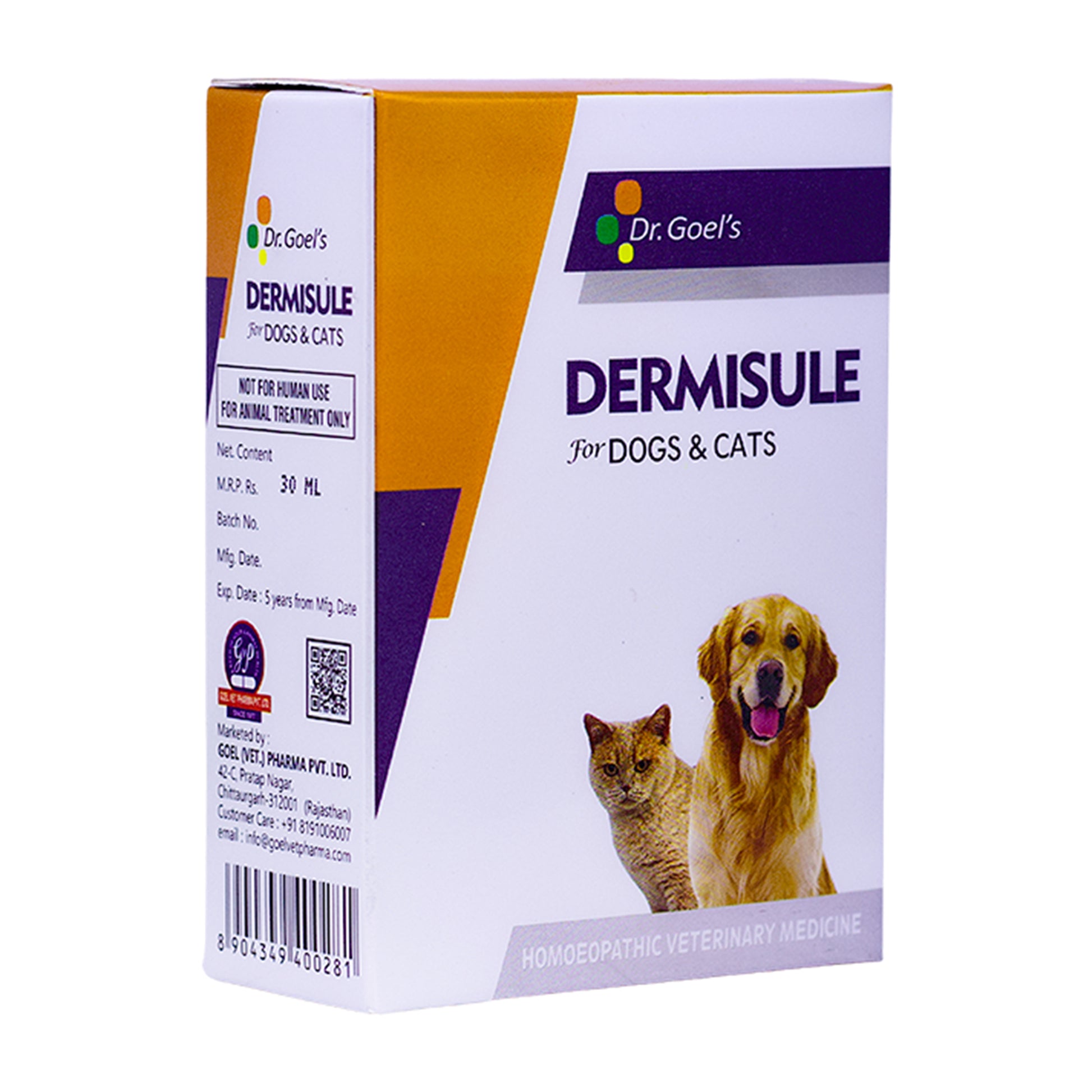 Homeopathic remedies work on the principle of “similia similibus curanter” which means “like cures like”, so our DERMISULE for pets is the best remedy for dogs suffering from different skin conditions like eczema, allergies, rashes, lesions with hair loss, redness, dry, scaly, pus, or bloody discharge. Specific or general lesions or spots as in Mange disease can also be improved.