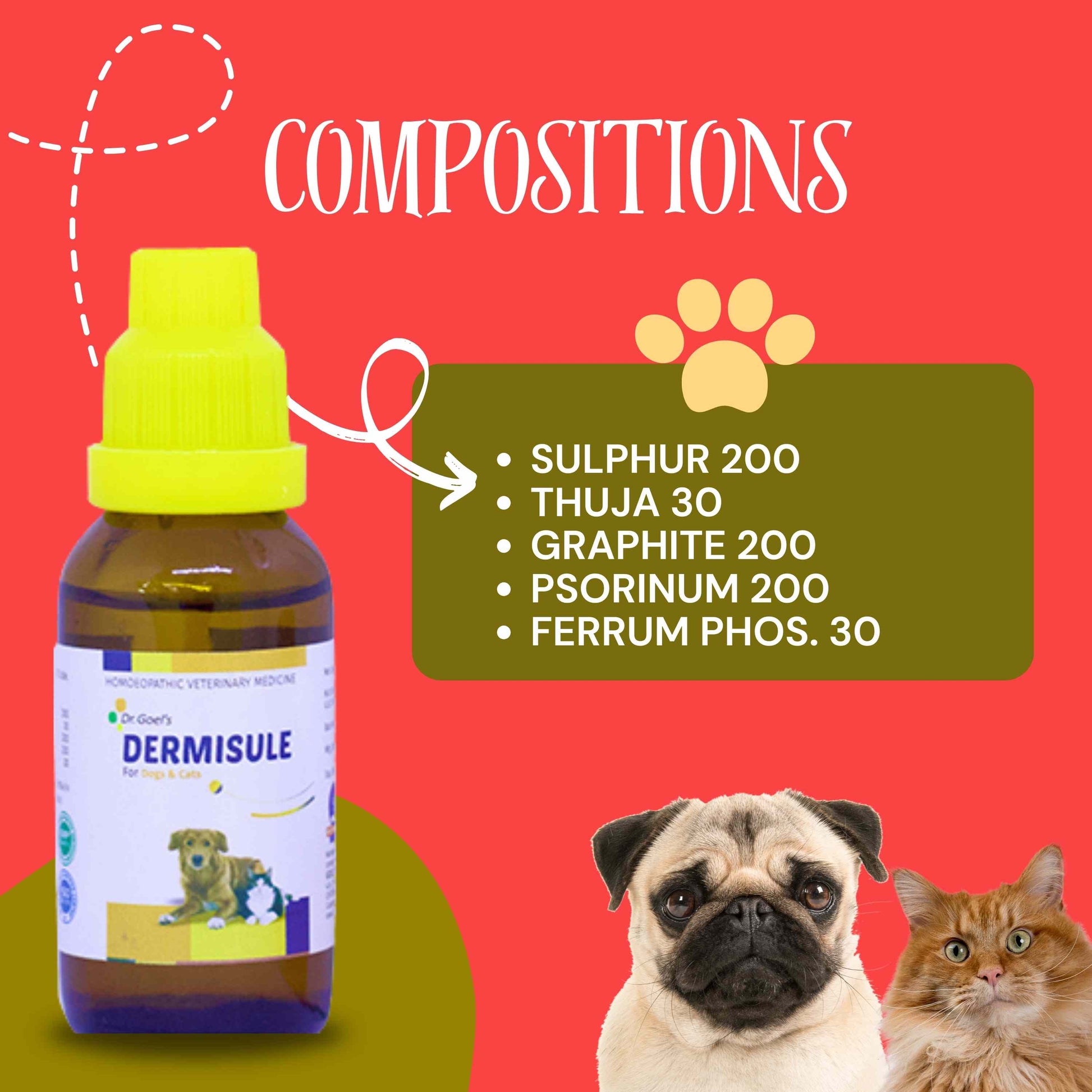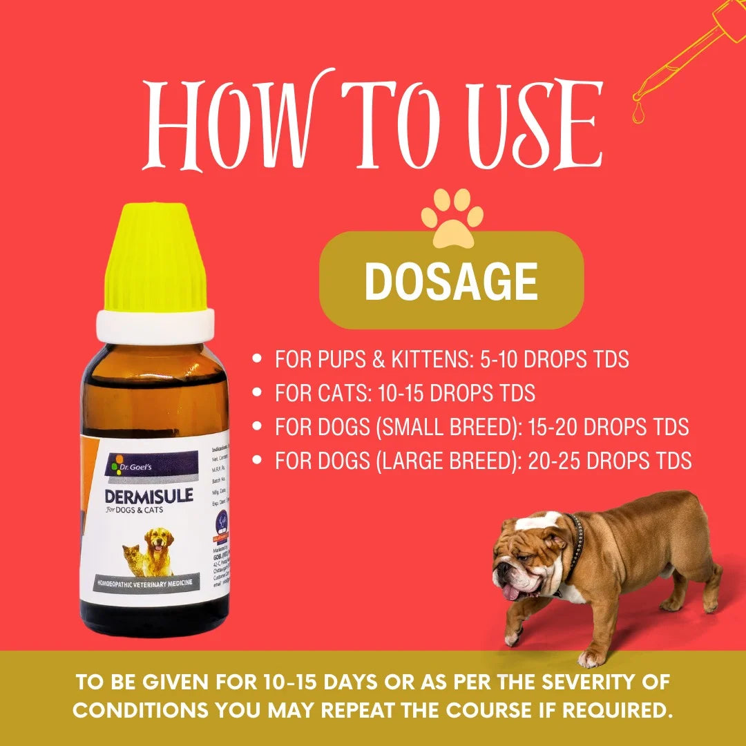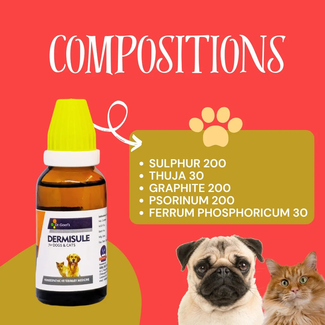 Homeopathic remedies work on the principle of “similia similibus curanter” which means “like cures like”, so our DERMISULE for pets is the best remedy for dogs suffering from different skin conditions like eczema, allergies, rashes, lesions with hair loss, redness, dry, scaly, pus, or bloody discharge. Specific or general lesions or spots as in Mange disease can also be improved.