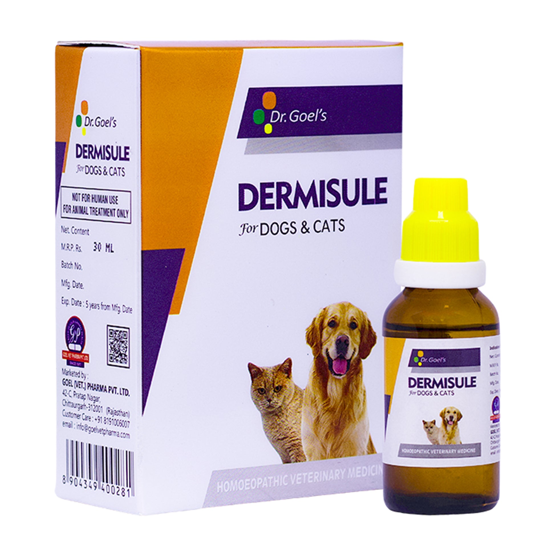 Homeopathic remedies work on the principle of “similia similibus curanter” which means “like cures like”, so our DERMISULE for pets is the best remedy for dogs suffering from different skin conditions like eczema, allergies, rashes, lesions with hair loss, redness, dry, scaly, pus, or bloody discharge. Specific or general lesions or spots as in Mange disease can also be improved.