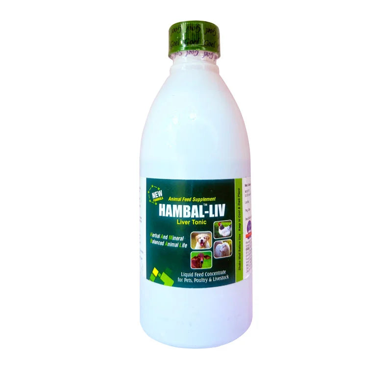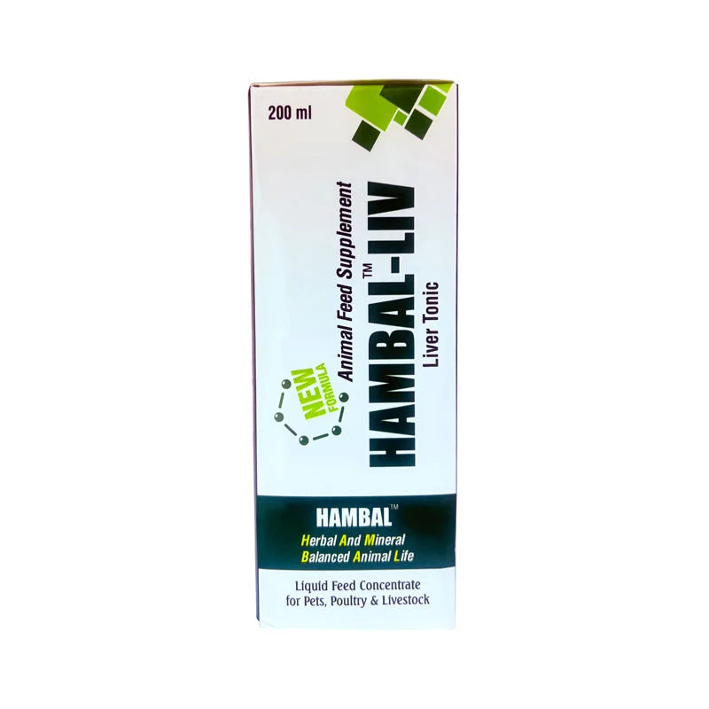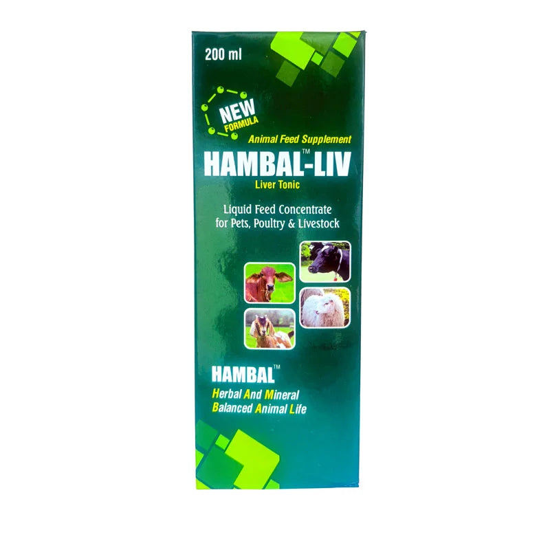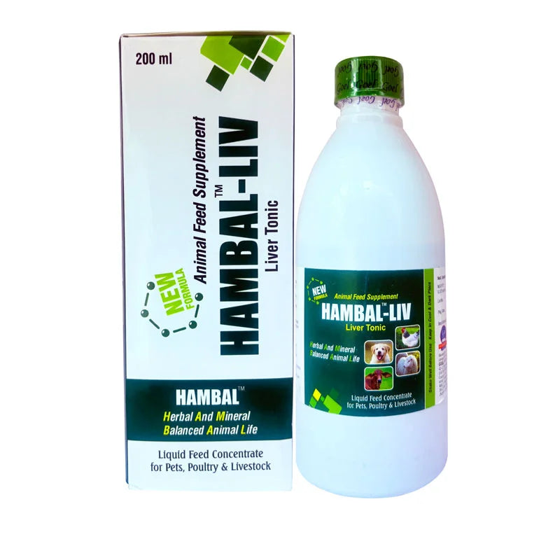 HAMBAL LIV 200ML is the best ANIMAL FEED SUPPLEMENT for LIVER problems where symptoms like indigestion, vomiting, eating of inanimate objects, stomachache, etc. It is useful in cases of sluggish liver functions and fatty liver and as a supportive treatment for jaundice, infantile jaundice, liver damage, and toxic liver damage. It also helps in many disorders of digestion such as indigestion, constipation, flatulence, and also in general detoxification of the system.