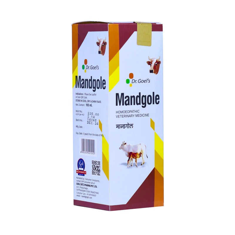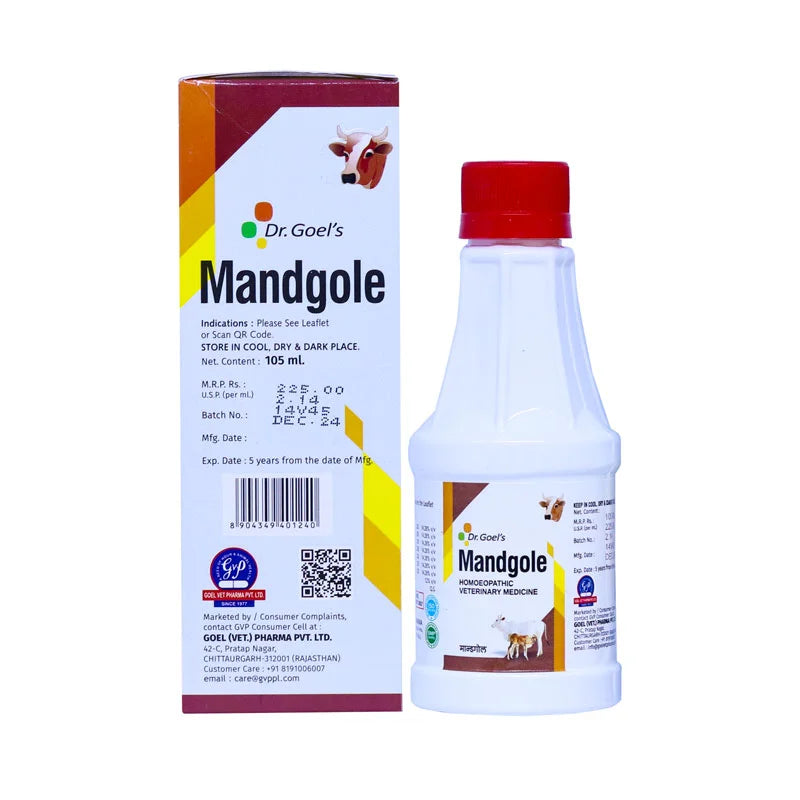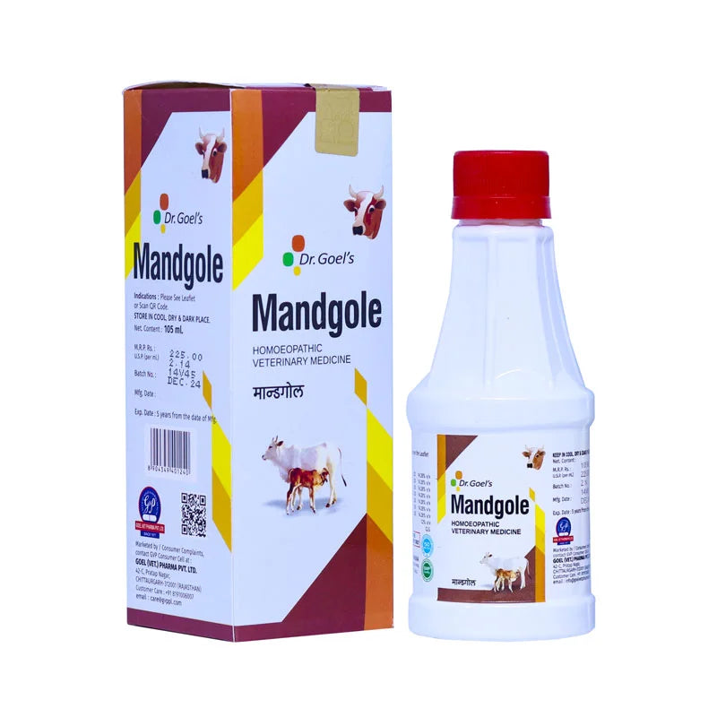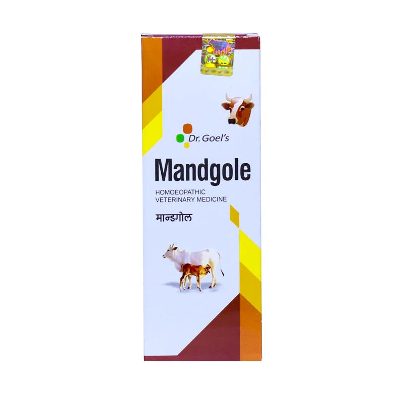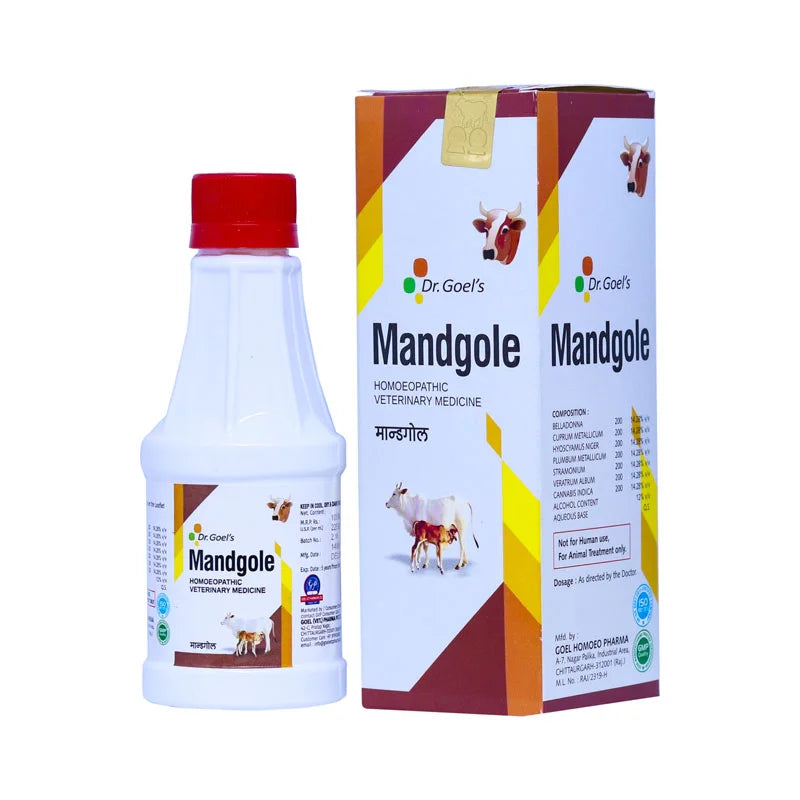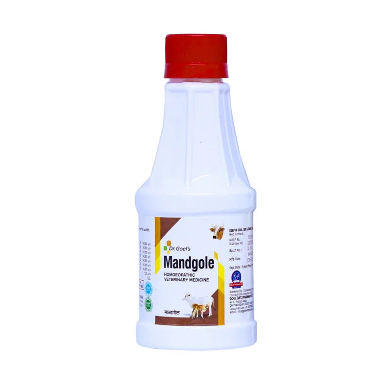 MANDGOLE is a Homeopathic Veterinary Medicine for symptoms of acute and chronic meningitis or surra like symptoms in large animals or treating the poisonings of fertilizer and harmful weeds in which excitement, mania, rage, or hallucination occurs due to physical irritability due to sudden changes in climatic temperature affecting the cattle health.