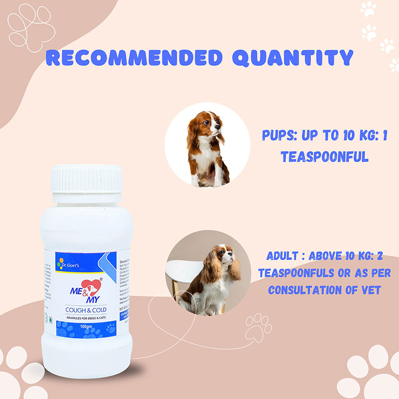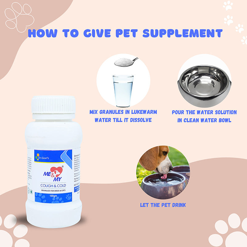 Me & My Cough & Cold Pet Supplement is to be given orally in the form of granules dissolved in lukewarm water. It can be given along with food or on an empty stomach but preferably dissolved in water to prevent dietary disturbances. It is safe even when given on an empty stomach without any effect on the stomach lining. It is effective within 5 to 7 days and improvement can be visually appreciated in due course of time for those who supplement their dog timely with patience.